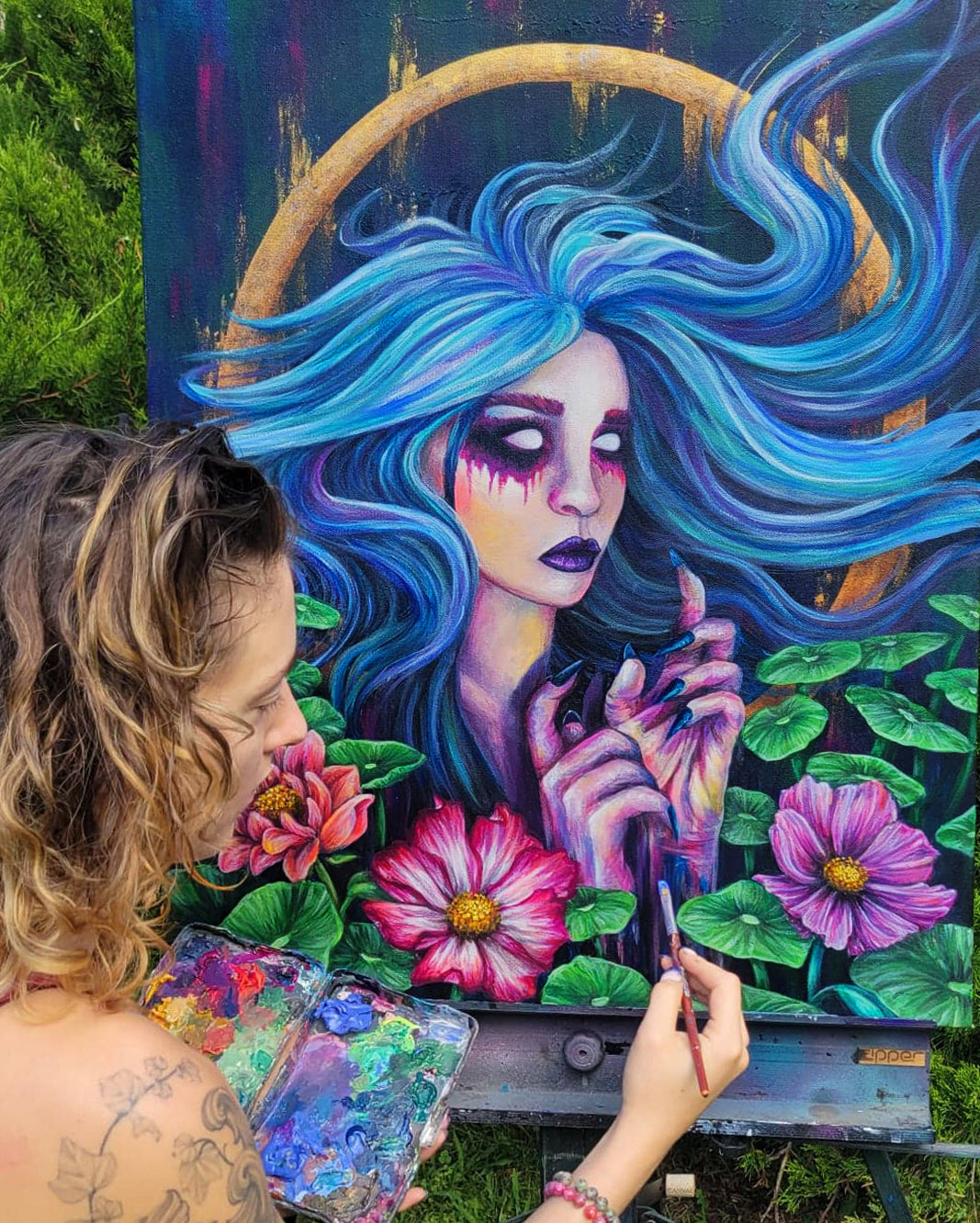 Her connections to the entertainment industry as a live painter and muralist have allowed her to share her craft with a wide audience across the country. Her works can be found with private collectors, galleries & mural walls spanning the U.S. including Denver, Austin, Chicago, Miami, and more.